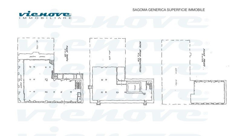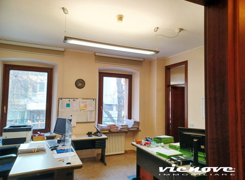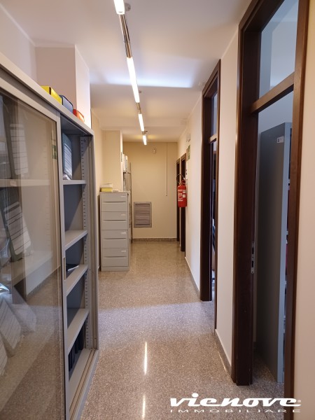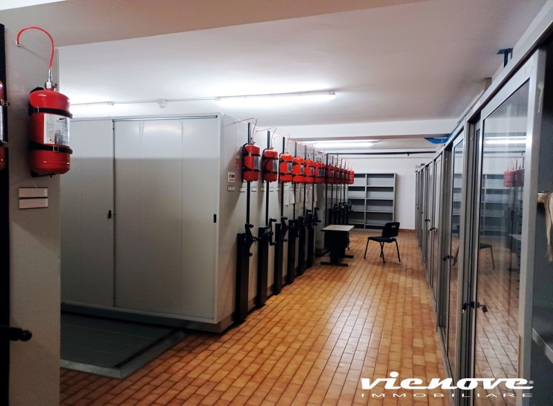 Al primo piano, di circa 170 mq, sono presenti diversi uffici disposti sui lati di un corridoio centrale, al termine del quale sono presenti due bagni. Il piano inferiore di circa 390 mq è composto da un caveau attualmente inutilizzato, un locale tecnico e un grande spazio adibito ad uso archivio.