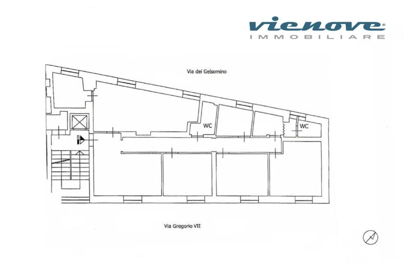 L’immobile, con doppio affaccio, sia su viale Gregorio VII che su via del Gelsomino, può prevedere un soggiorno con cucina separata, 3 camere e due bagni.