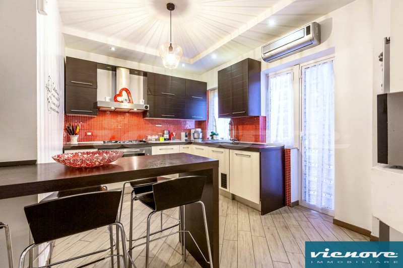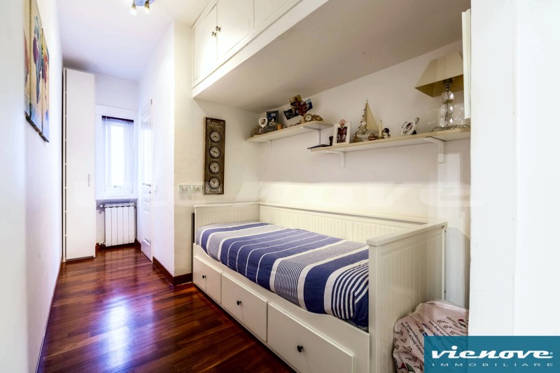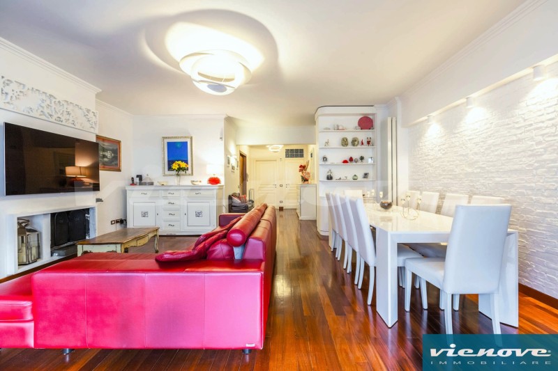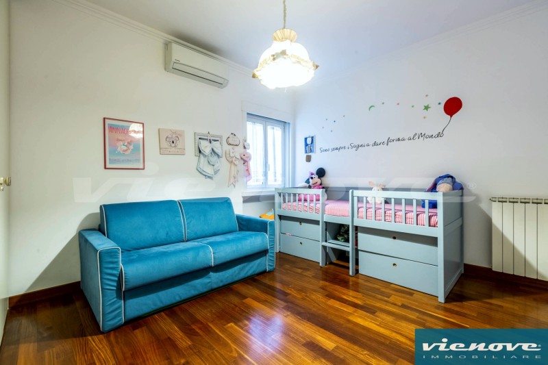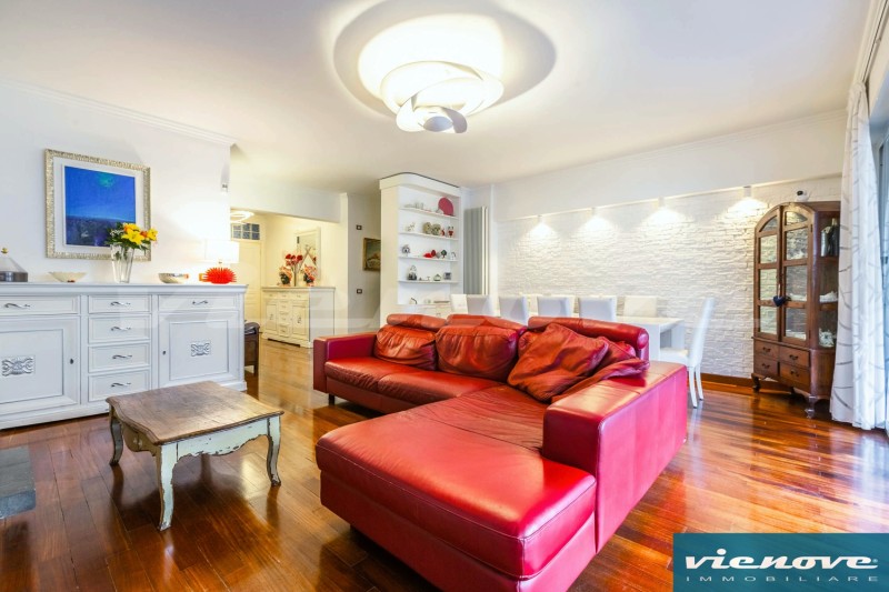 La disposizione degli ambienti è molto razionale, con un ingresso che si apre da una parte verso il salone (con camino funzionante), per poi raggiungere la terrazza, da una parte verso la camera di servizio con il suo bagno e verso la cucina abitabile e dall’altra parte verso la zona più riservata della casa, dedicata alle due stanze da letto ed un bagno padronale.