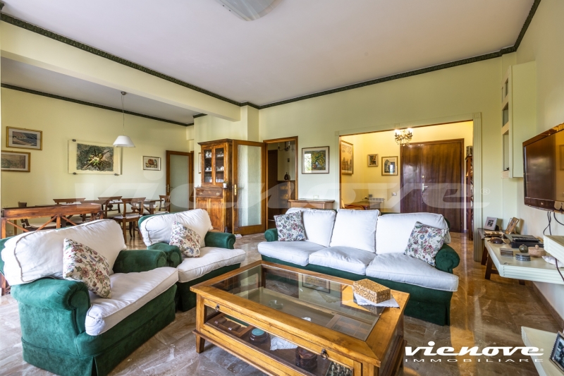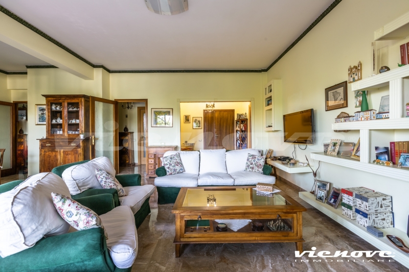La proprietà è composta da un salone doppio, con accesso ad un primo terrazzo; una cucina abitabile; 2 camere da letto matrimoniali, ciascuna con affaccio su un’altra ampia terrazza, ed una stanza/studio; due bagni. Pertinenze dell’immobile sono una cantina, un posto macchina coperto nel garage condominiale e la possibilità di parcheggiare un’auto nel parcheggio condominiale esterno.